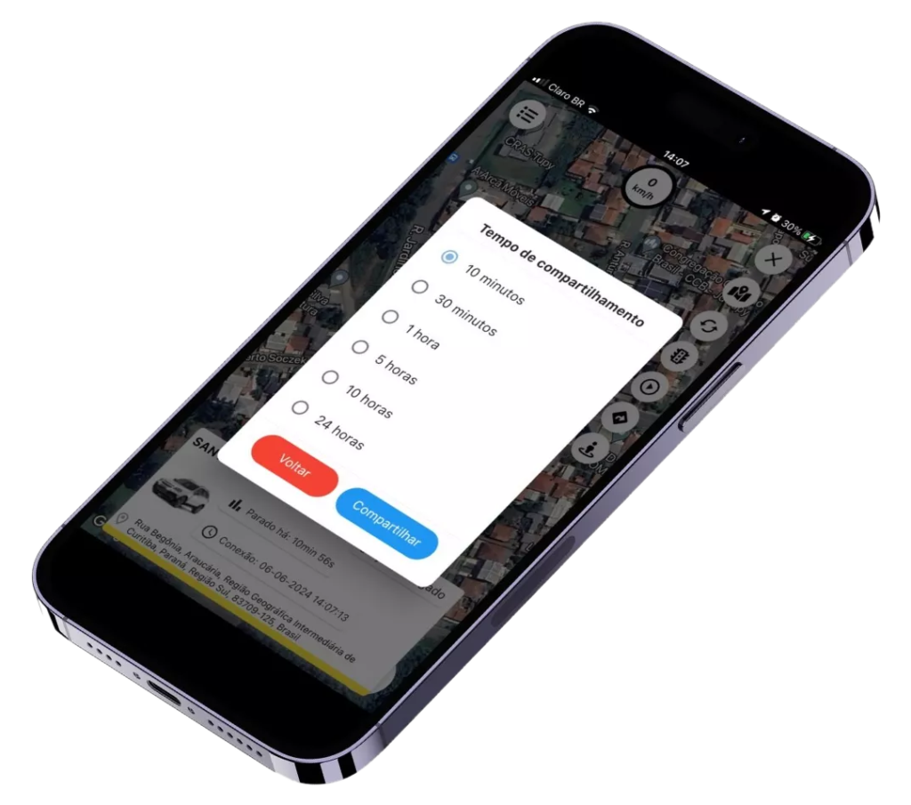 Além disso, a rota percorrida pelo veiculo pode ser compartilhada em tempo real com varias pessoas atravéz do envio de um link que fica ativo por um perido de tempo definido.